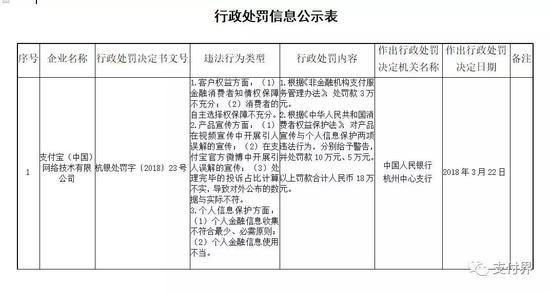 2018年3月22日中国人民银行杭州中心支行对支付宝做出行政处罚决定,支付宝(中国)网络技术有限公司因七项违规行为被合计罚款共18万元。 支付宝违法行为类型为客户权益、产品宣传、个人信息保护三大方面。 1、客户权益方面: (1)金融消费者知情权保障不充分; (2)消费者的自主选择权保障不充分。 2、产品宣传方面: (1)在视频宣传中开展引人误解的宣传; (2)在支付宝官方微博中开展引人误解的宣传; (3)处理完毕的投诉占比计算不实,导致对外公布的数据与实际不符。 3、个人信息保护方面: (1)个人金融信息收集不符合最少、必需原则; (2)个人金融信息使用不当。 根据《非金融机构支付服务管理办法》,处罚款3万元。根据《中华人民共和国消费者权益保护法》,对产品宣传与个人信息保护两项违法行为,分别给予警告,并处罚款10万元、5万元。以上罚款合计人民币18万元。 责任编辑:jimmonzang | |