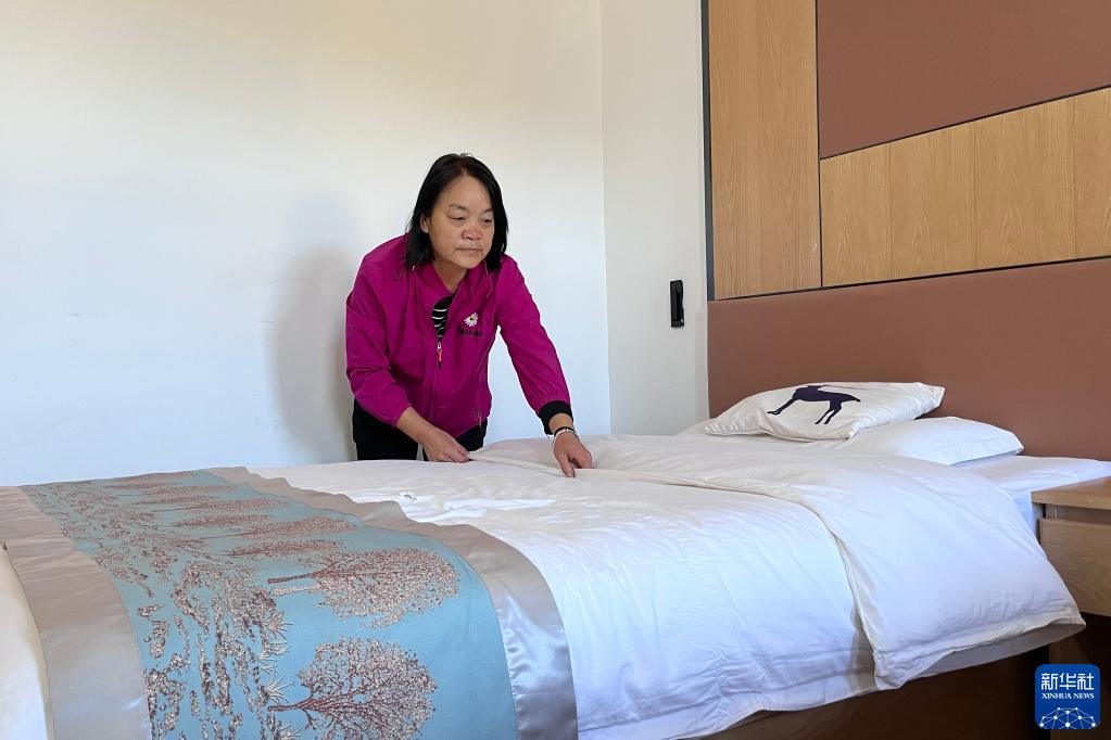 在黑龙江省漠河市北极镇北红村,张翠花在整理客房(8月27日摄)。新华社记者 杨思琪 摄 墙上贴着的脱贫户资料卡展示了刘桂英收入来源。低保金5220元、土地流转收入3626元、扶贫产业分红8498元……2021年,刘桂英的收入超过2万元。夏秋闲暇时,她还到周边山上采些蘑菇、蓝莓等山货,自己吃不了的就卖给游客。谈起眼下的好日子,刘桂英笑得合不拢嘴。 如何让脱贫户持续增收,北红村出实招。去年,依托农田路维修、旅游环境改造,北红村新建粮食加工厂改造等项目,全村产业基础进一步提升。村里在上级支持下还建设了蛋鸡养殖场,收益的60%用于脱贫户分红,户均达3000元。 “脱贫只是开始,让乡亲们致富才是目标。”北红村驻村第一书记史继友说,随着自驾游、“找北游”的兴起,很多背着相机、拉着行李箱的游客从各地赶来,夏天消夏避暑、期盼邂逅极光,冬天赏冰玩雪、体验“泼水成冰”,曾经的最北、极寒等劣势,变成了发展旅游的招牌。