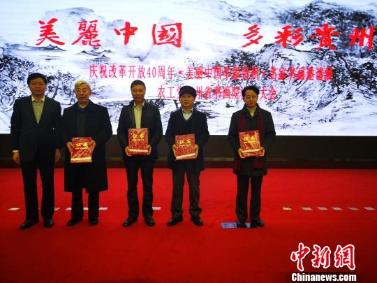 庆祝改革开放40周年・美丽中国・多彩贵州・名家书画邀请展现场。 赵万江 摄 会上,举行了农工党贵州省书画院授牌仪式,相关负责人向书画院名誉院长、特聘书画家颁发了证书和聘书。 “希望农工党贵州省委要以成立书画院为契机,广泛吸取高端艺术人才,培植有代表性的优秀后备力量,团结凝聚全省党内专家资源,进一步发挥积极作用。”农工党中央副主席兼秘书长、农工党中央书画院院长曲凤宏表示,要始终坚持把讲政治和思想建设放在首位,继承发扬优良传统,弘扬主旋律,传播正能量,把书画院建设成为配合农工党总体工作、团结党员,为促进社会主义事业建设做出积极贡献的排头兵,以书画为媒、用笔墨抒怀,用艺术作品感染人,扩大农工党的社会影响力。