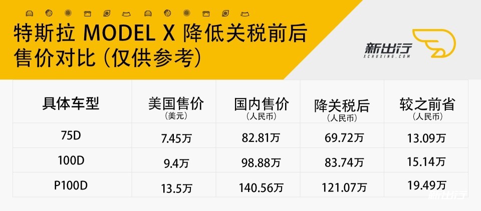 「图」以上售价仅供参考,实际以官网售价为准 从我们的计算结果来看,Model S P100D 车型相比关税降低前,售价最高能降低 15 万元,最低的 75D 也能降低 10 万元左右。而售价较高的 Model X 最高售价能降低 19.5 万元左右。