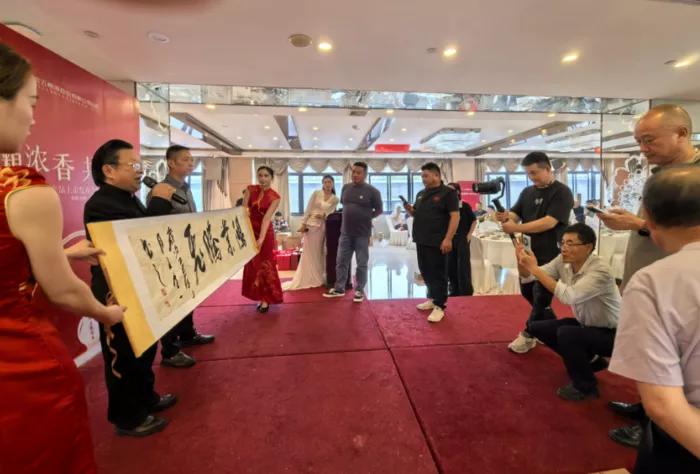 9月20日上午,在“霸都”合肥瑶海区爱瑞德商务连锁酒店,一场盛大的文化盛宴——五粮浓香酒安徽合肥新品上市发布会暨中国国画院华东分院十六周年庆典盛大开幕。此次发布会不仅是一次新品推广的盛会,更是一场文化与艺术的融合体验。 享有盛誉的中国国画院华东分院行政院长王全一,作为特邀嘉宾,亲自到场,现场悬空书法写下《喝五粮液酒,交天下朋友》、《鸿业腾飞》两幅作品,将五粮液的酒香与文化底蕴完美结合。